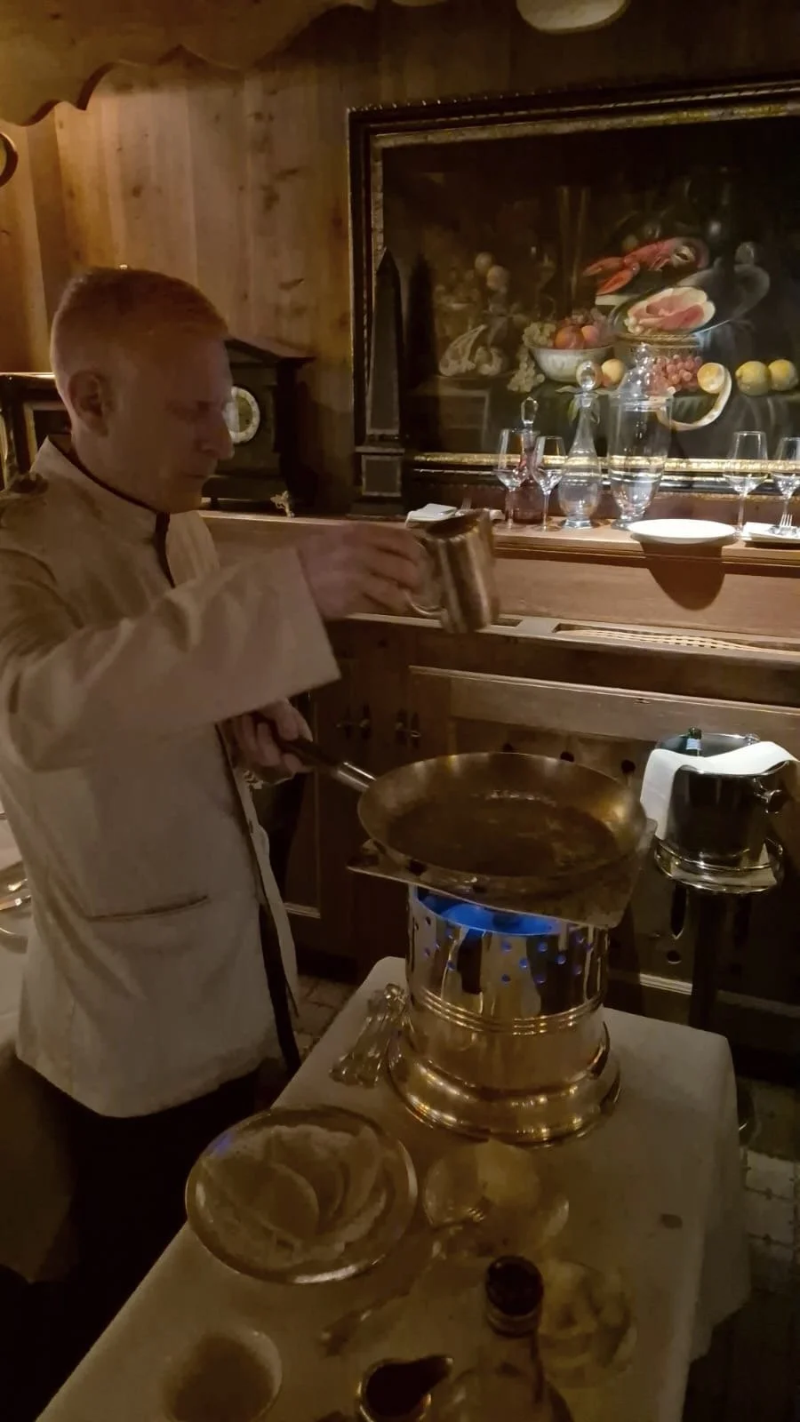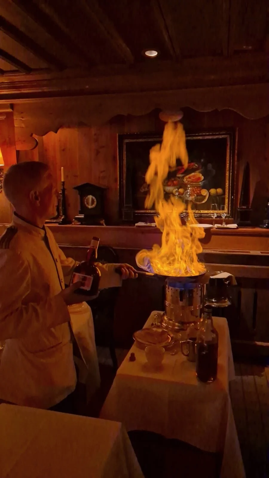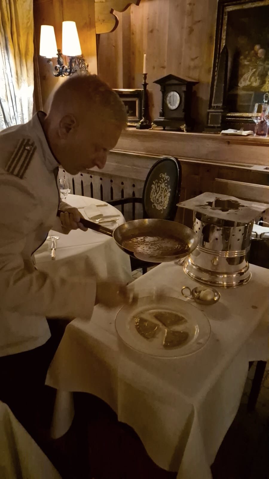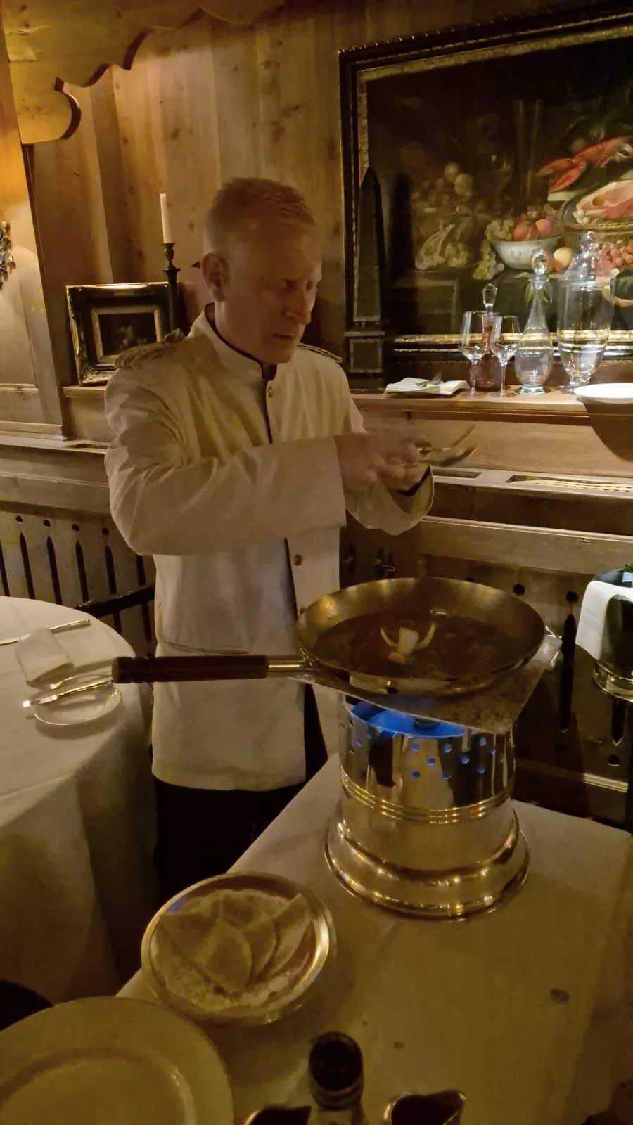 The Crepe Suzette including live show at the table with a burning flame fueled by Grand Marnier